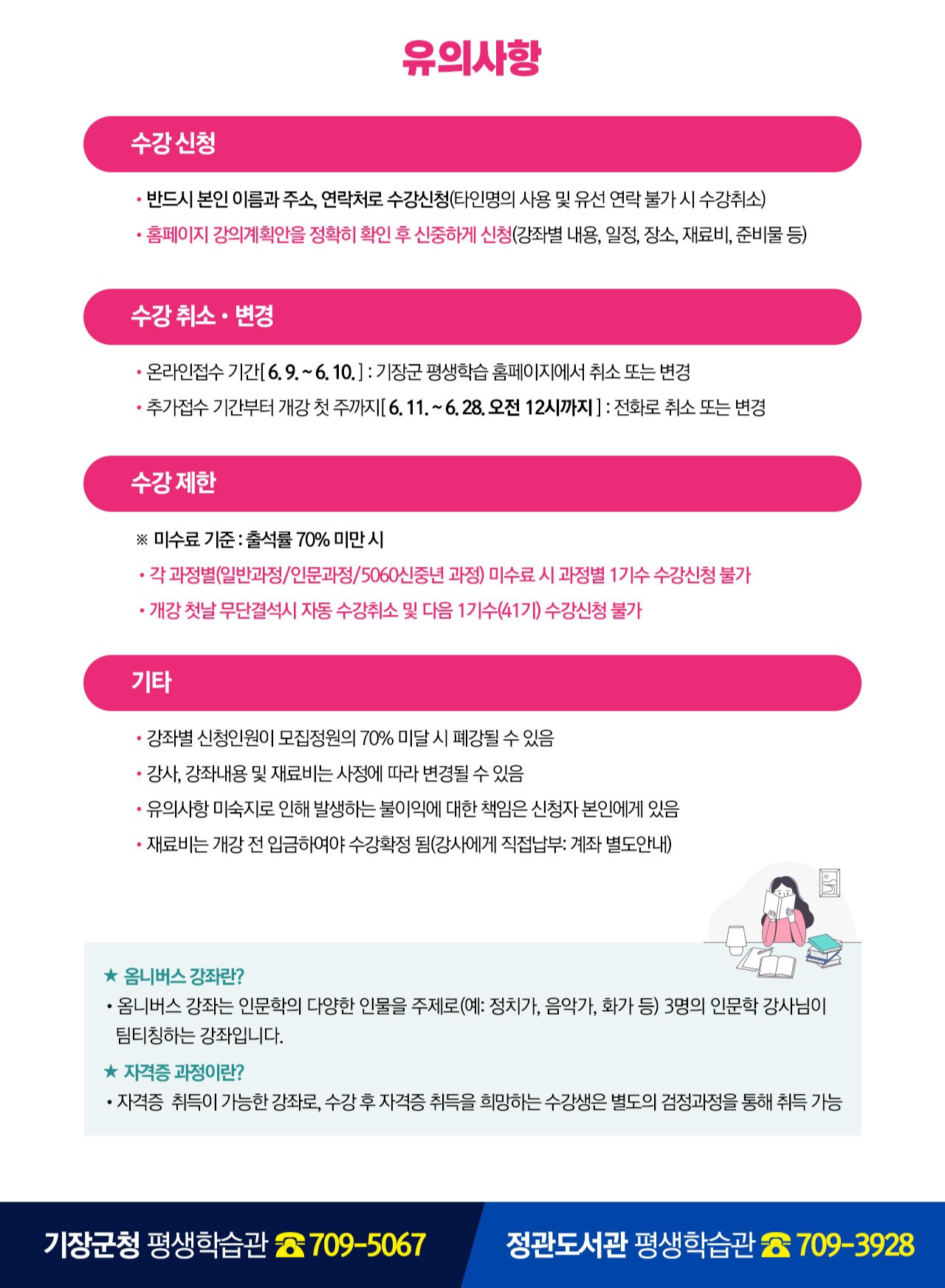 📎 유의사항 꼭 확인해주세요! 출석률 70% 미만 시 미수료 처리되며 다음 학기 수강 제한 개강 전까지 재료비 입금 필수 (강사에게 별도 안내 예정) 중복 접수 불가 – 일반과정, 인문과정, 5060과정 중 1인 1강좌만 신청 가능 접수는 본인 명의로만 가능, 대리 접수 또는 타인 명의 불가