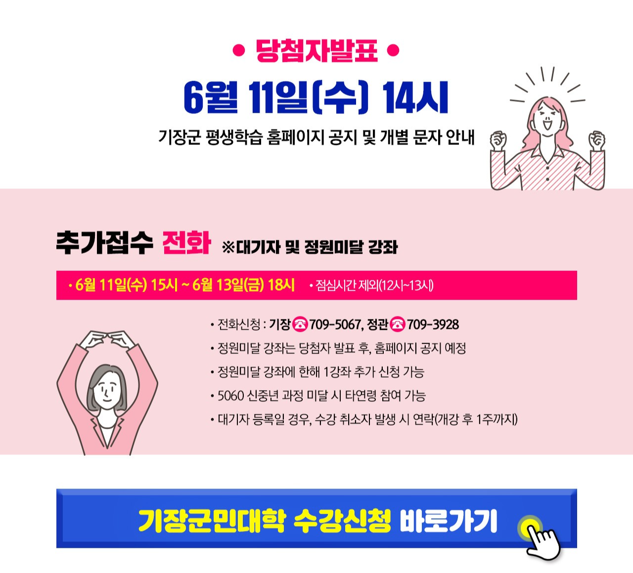수강 확정자 발표는 6월 11일(수) 14시, 홈페이지 공지 및 문자 발송 예정