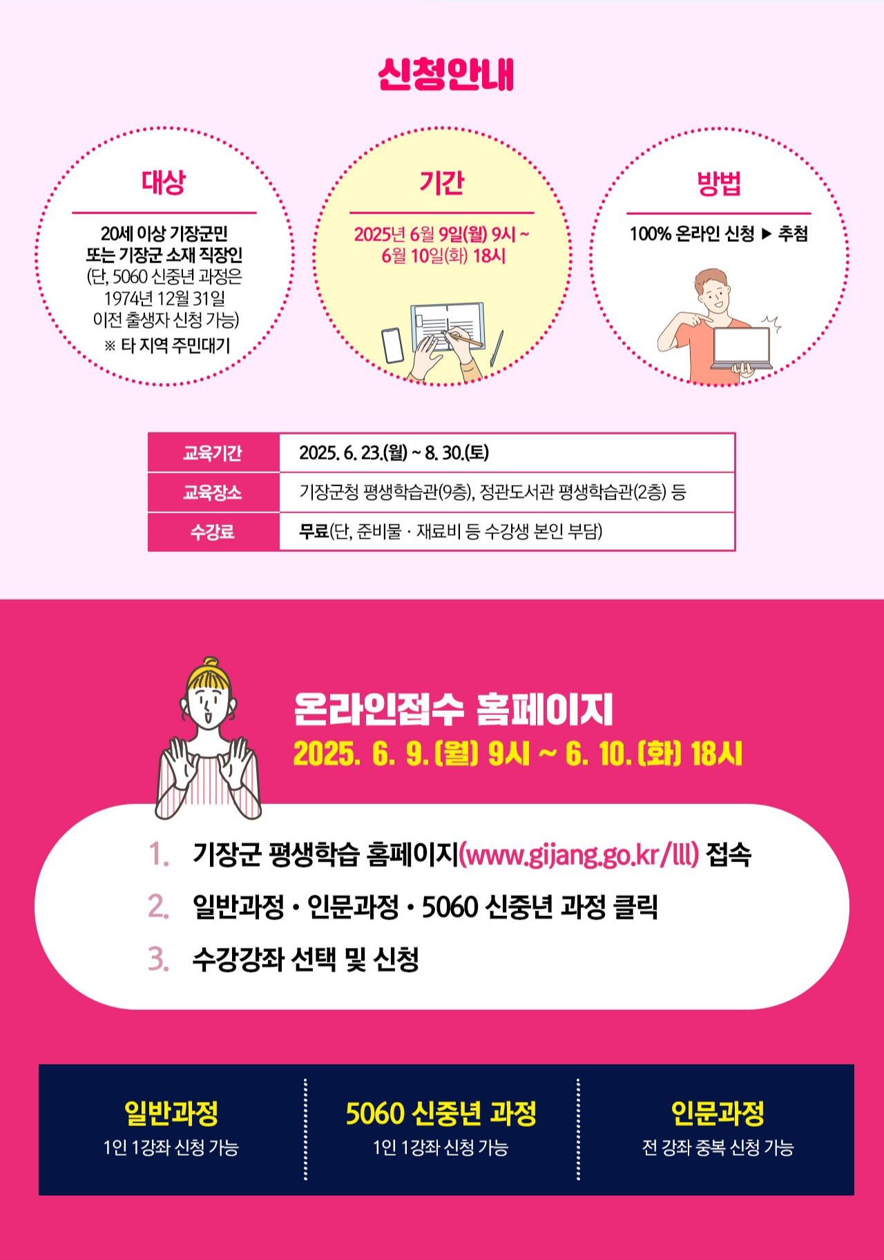 📎 유의사항 꼭 확인해주세요! 출석률 70% 미만 시 미수료 처리되며 다음 학기 수강 제한 개강 전까지 재료비 입금 필수 (강사에게 별도 안내 예정) 중복 접수 불가 – 일반과정, 인문과정, 5060과정 중 1인 1강좌만 신청 가능 접수는 본인 명의로만 가능, 대리 접수 또는 타인 명의 불가